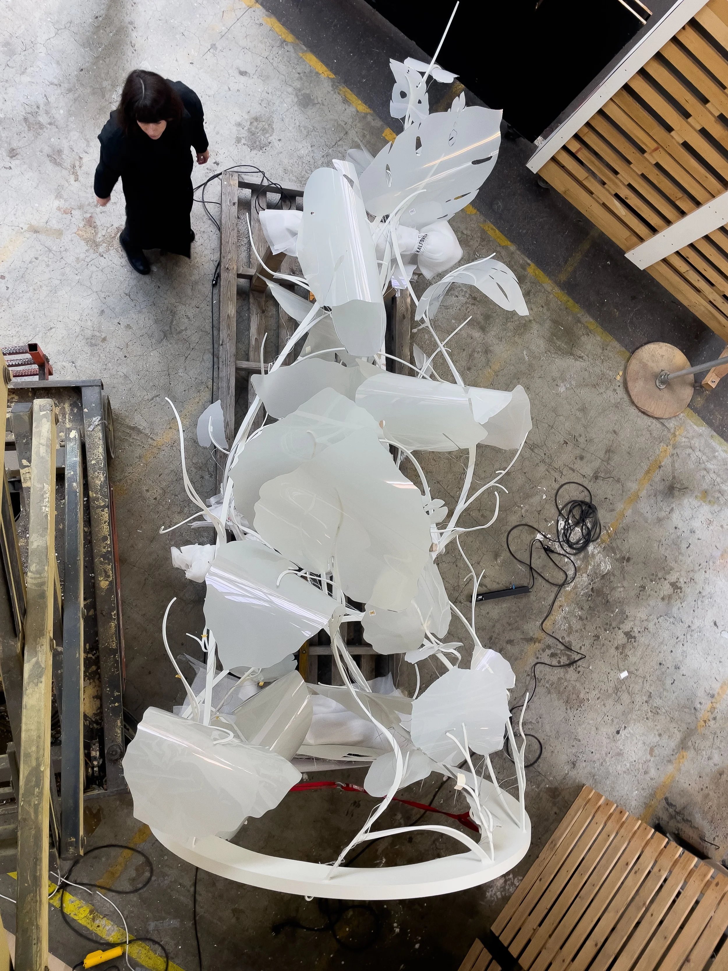 Suspended from the ceiling in the heart of the Congress Centre, world leaders will experience a real-time visualisation of the state of forests each time they pass beneath. The artwork transforms live environmental satellite data and brings it alive in a tangible, constantly evolving canopy of leaves that have the unique capability to become transparent or not. Each disappearing leaf represents 100 square metres of forest lost in real time; each returning leaf symbolises the same area of forest regained. Making it a visually intriguing work with a confronting message.